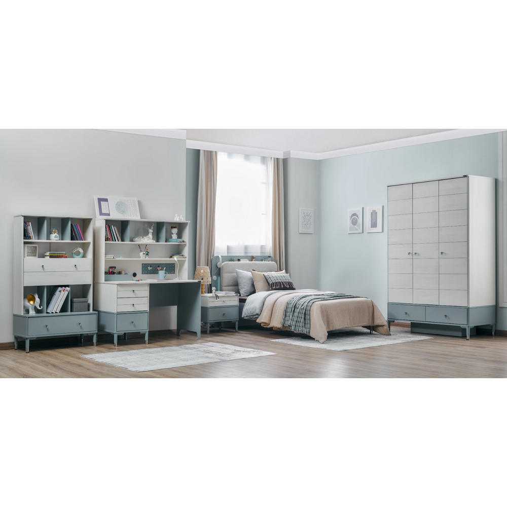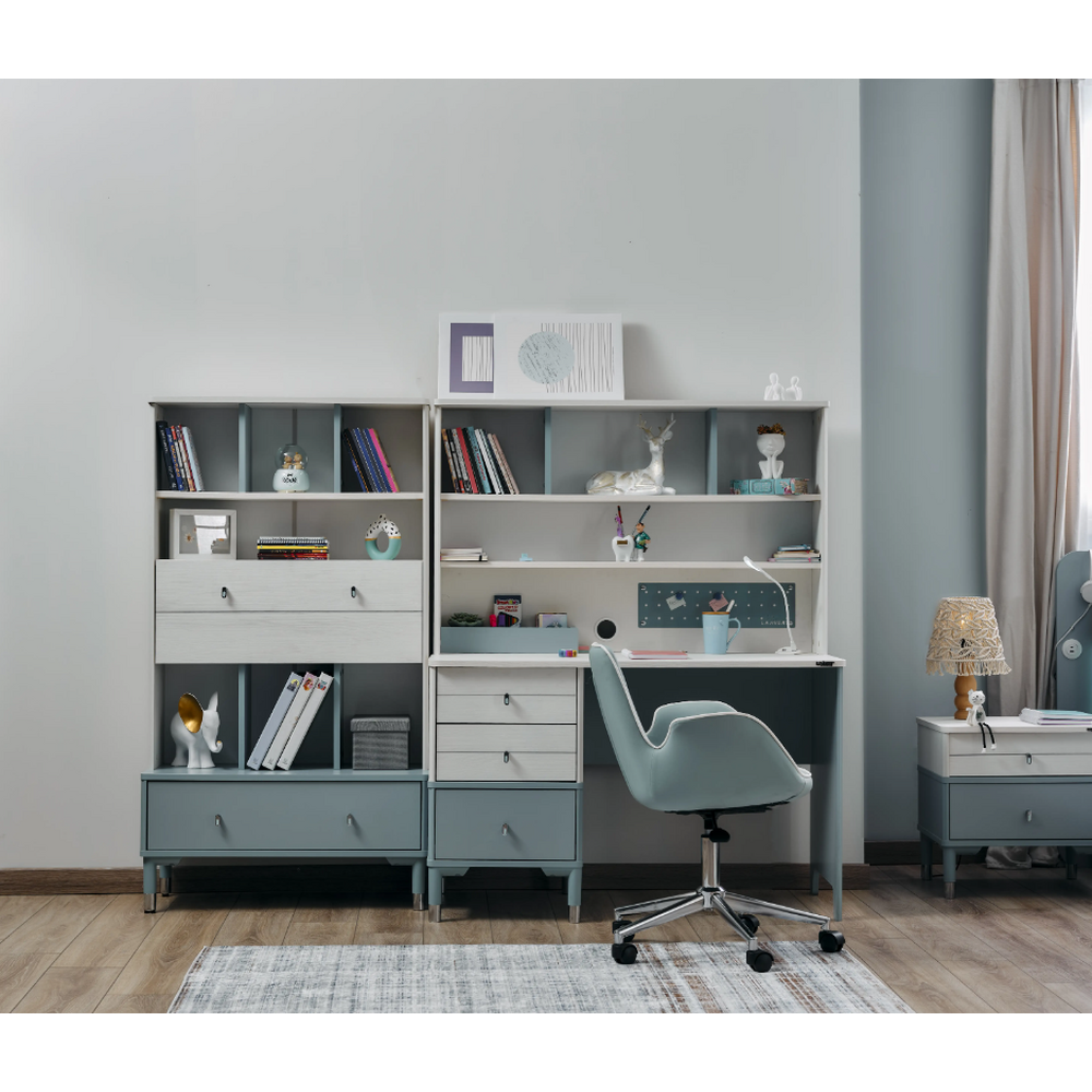 Biroul cu suprapozabil,Maryn este o piesă de mobilier lucrată elegant, aceasta impresionând prin fomele si culoarea de un albastru marin pastelat.