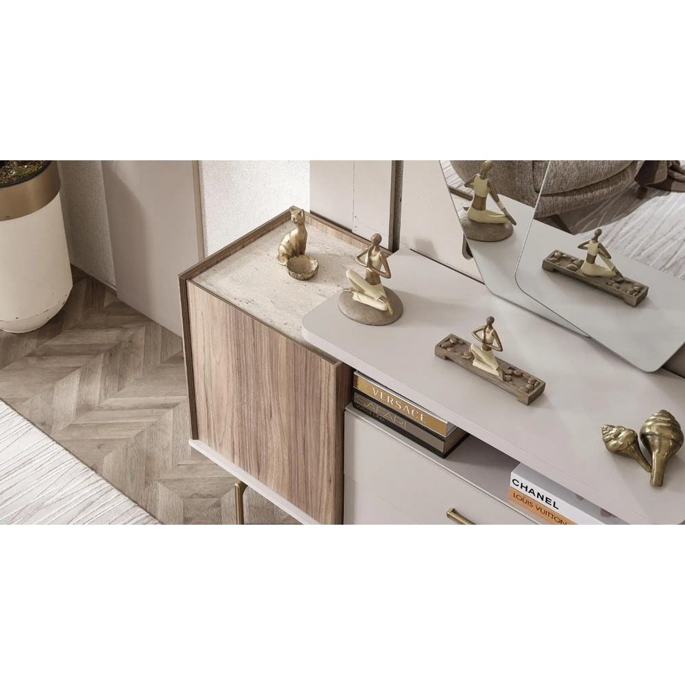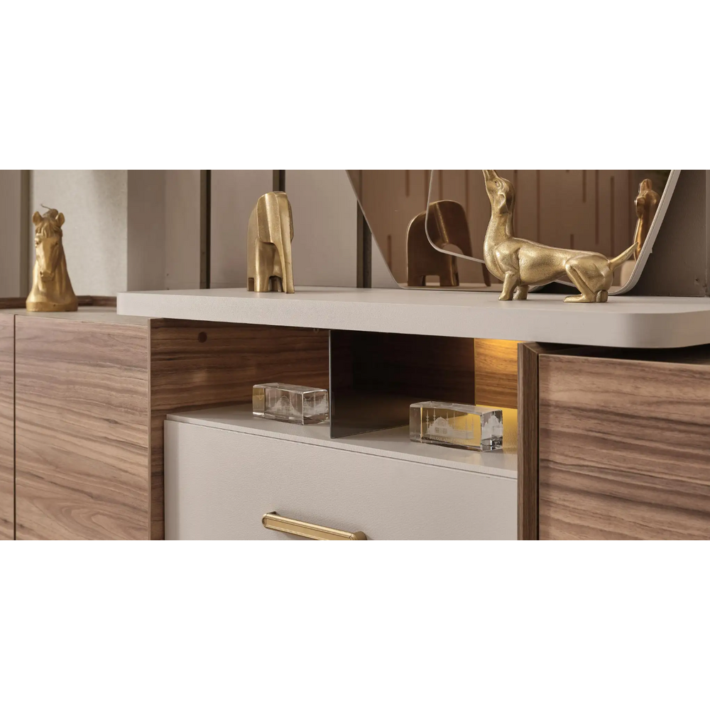 Mânerele și picioarele aurii ale bufetului sunt un accent subtil