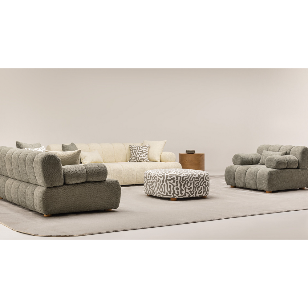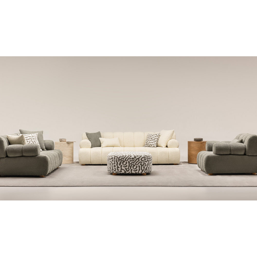 Bratele curbate ale canapelei cat si al fotoliului sunt frumos lucrate, urmarind o linie ergonomica, pentru a-ti sprijini bratele atunci cand stai la televizor, sau cand citesti.Ampleaseaza canapeaua Oslo in living unde va fi piesa de rezistenta, sau intr-un salon sau birou pt o atmosfera sofisticata.Tapiteria premium Boucle și pernele moi asigură o experiență de relaxare de neegalat.