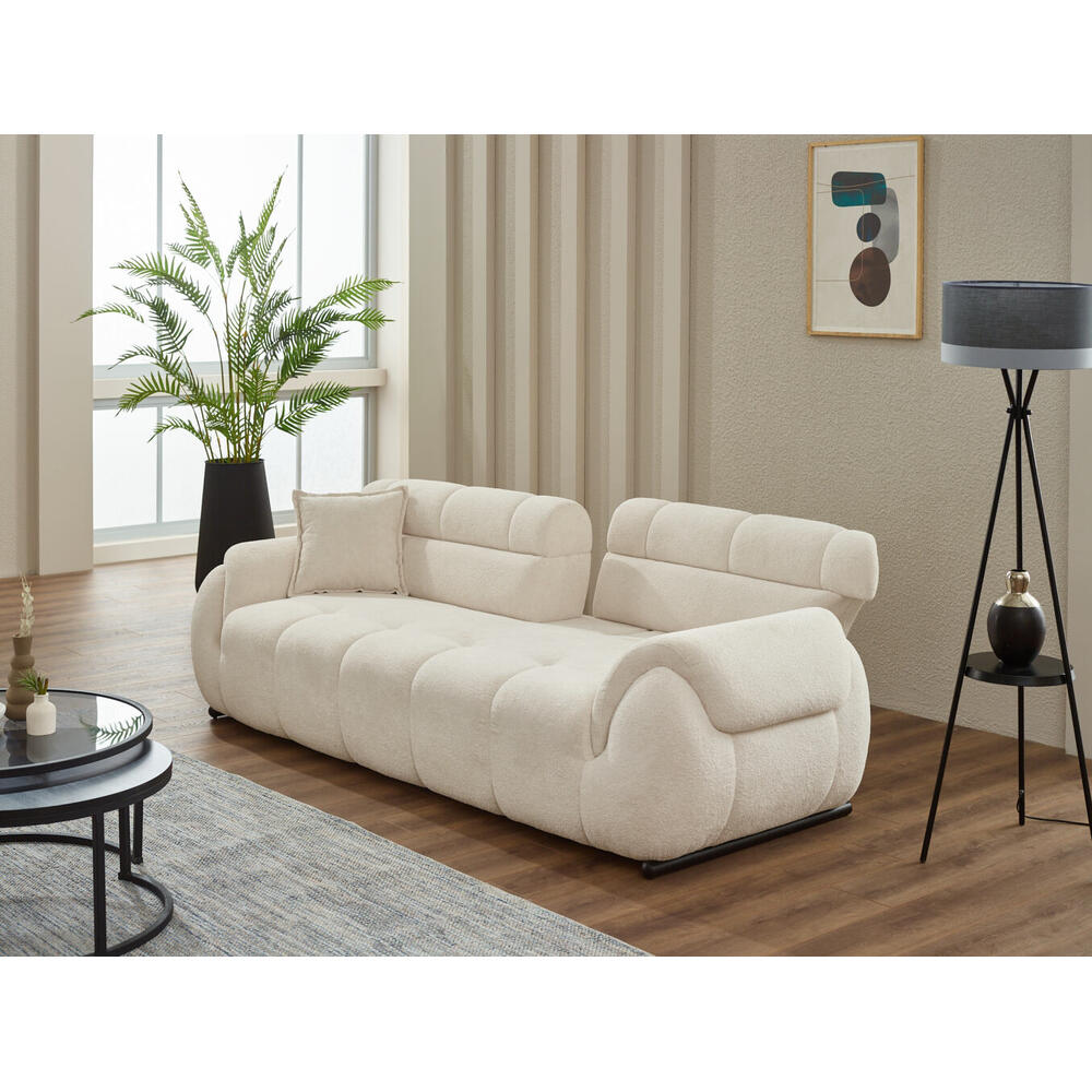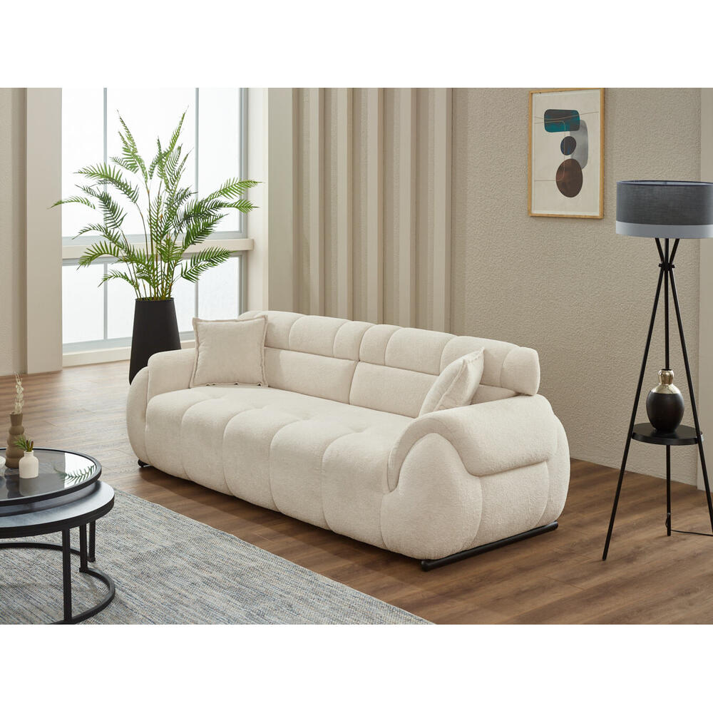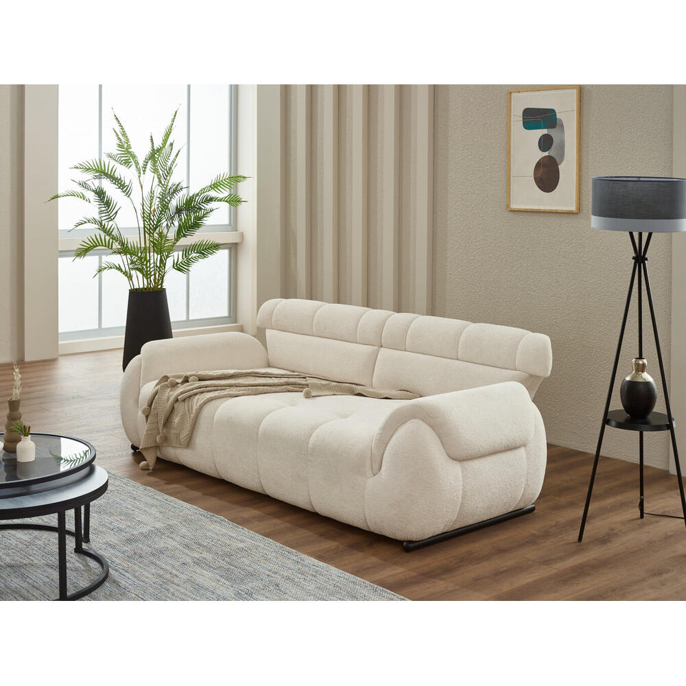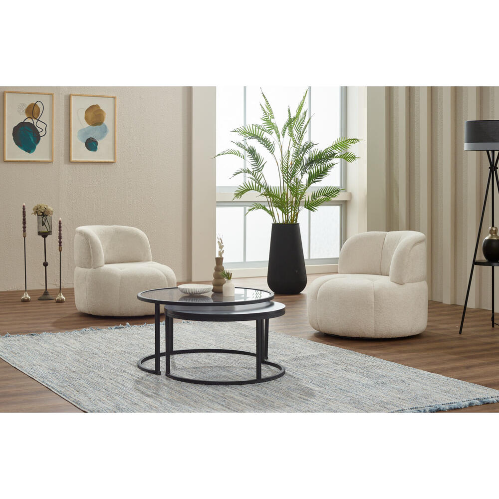 Creează un living modern și primitor cu acest set de canapele tapițat cu material bouclé, completat de fotolii rotative, ideale pentru flexibilitate și confort sporit. Textura distinctivă a materialului bouclé oferă un aspect sofisticat și o senzație plăcută la atingere, fiind perfectă pentru spații contemporane.