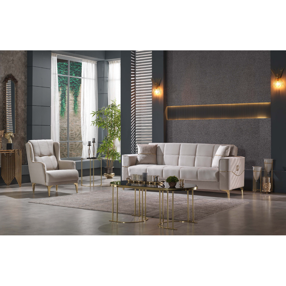 și fotolii Clara, în nuanța fină de crem și inserții aurii. Gândit pentru a