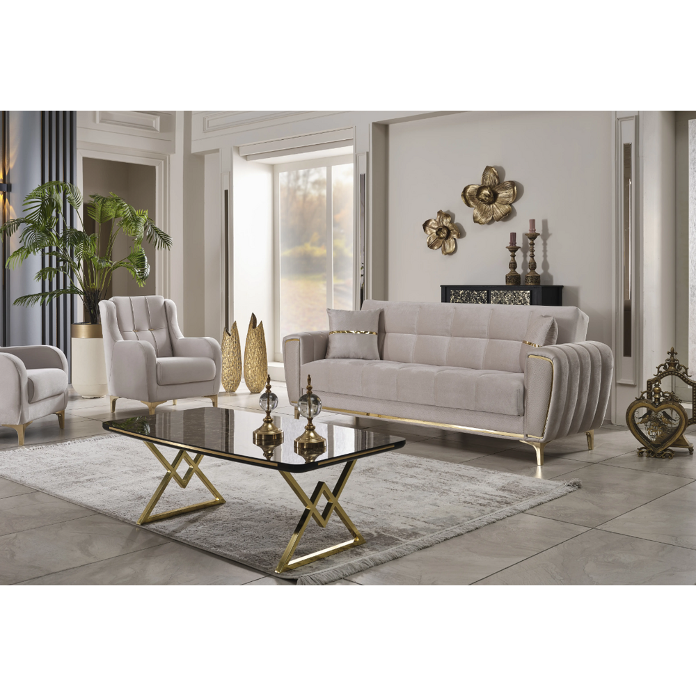 camera de zi. Detaliile curbate, spatarul comod si picioarele inaltate de la