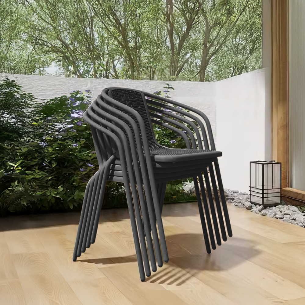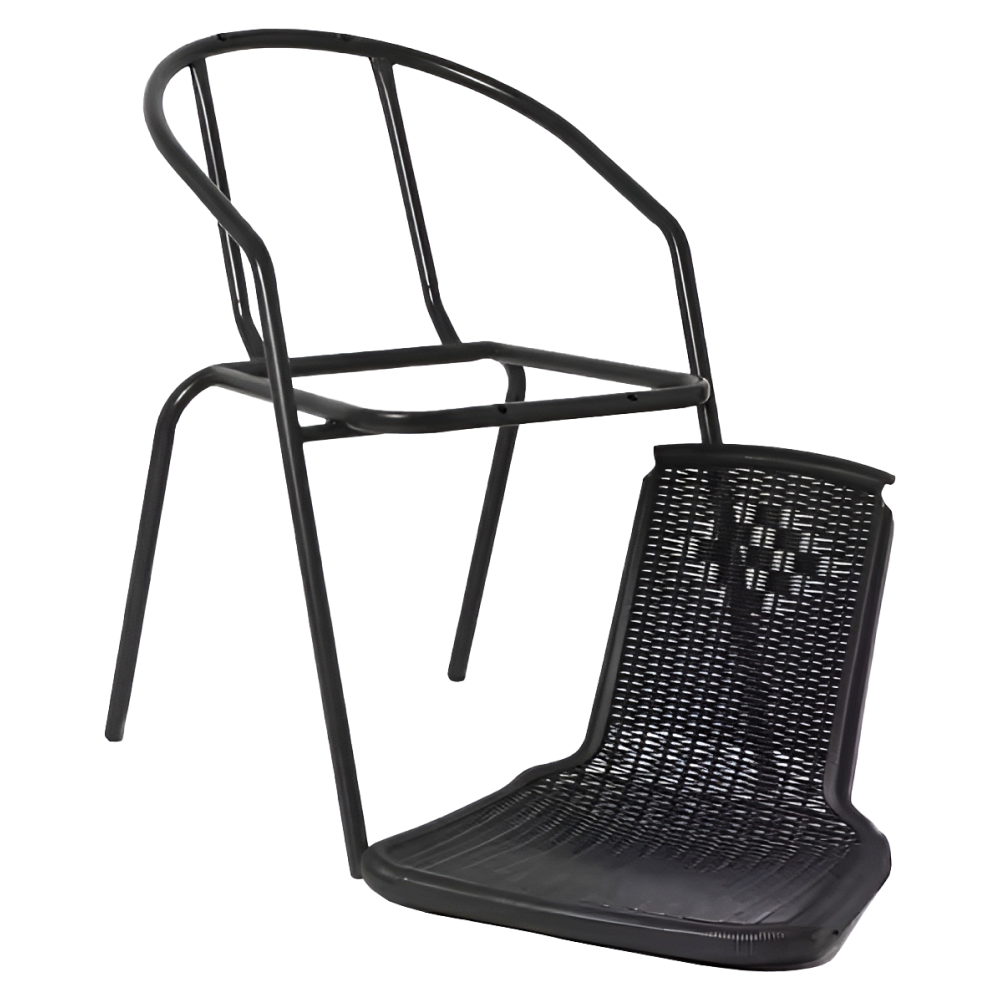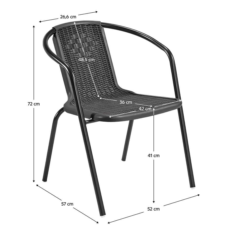 Material: metal/plastic Culoare: neagră Dimensiuni (lxAxh): 52x57x72 cm Înălţimea părţii de şezut: 41 cm Adâncimea părţii de şezut: 36 cm Lăţimea părţii de şezut: 42 cm Lăţime spate: 26,6 cm Înălţime spătar: 48,5 cm Portanţă: 150 kg Greutate: 3 kg Grădină stivuibilă Design modern Depozitare uşoară Întreţinere uşoară Livrat asamblat