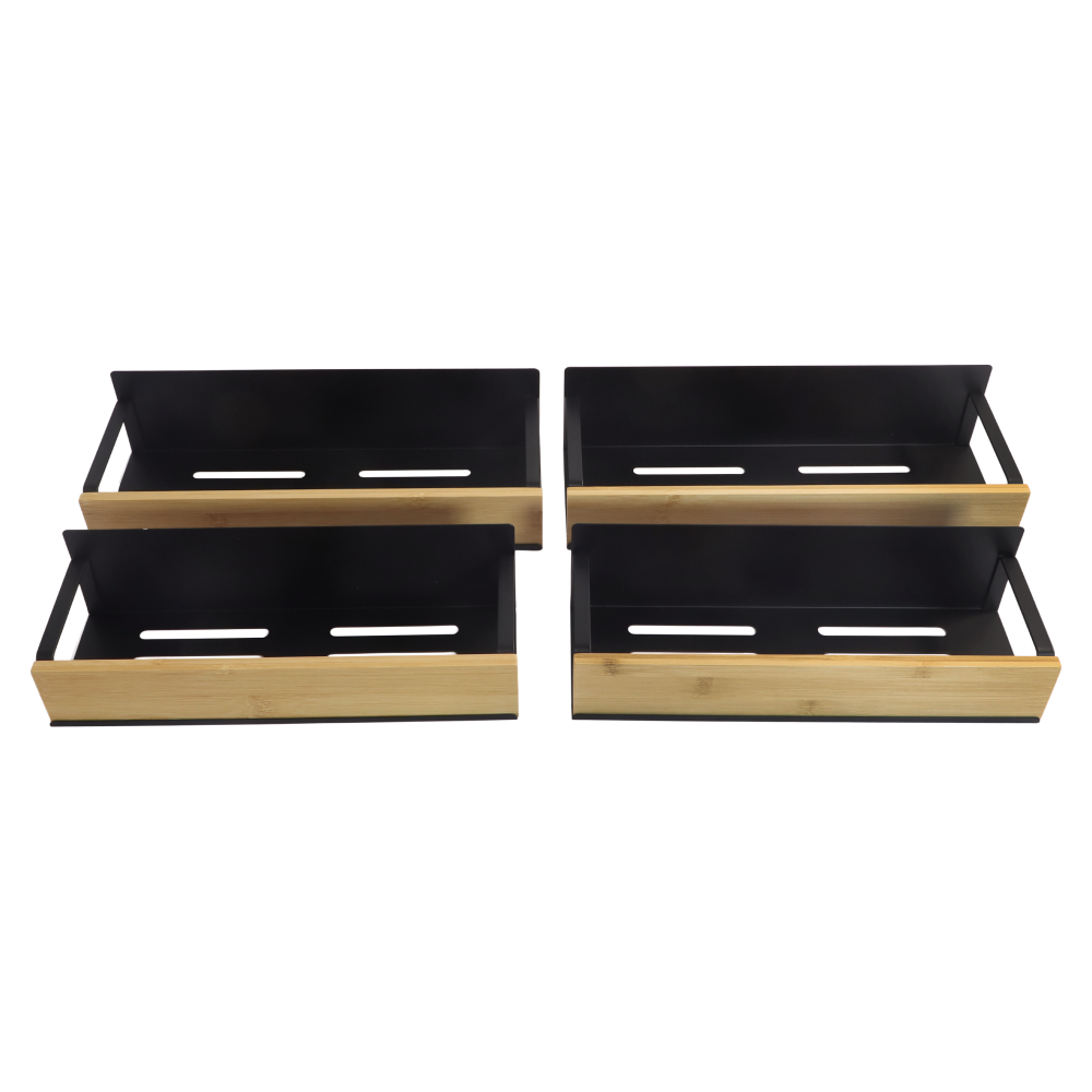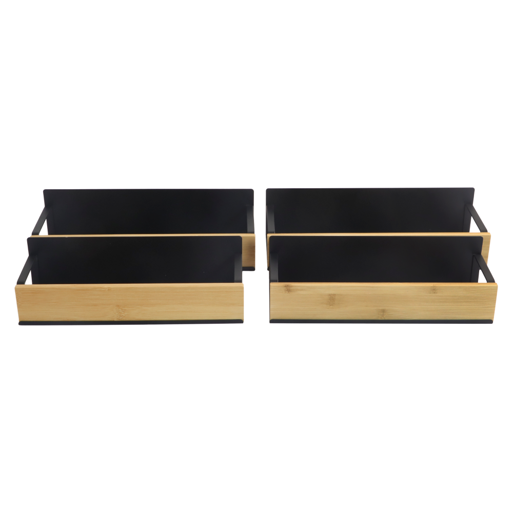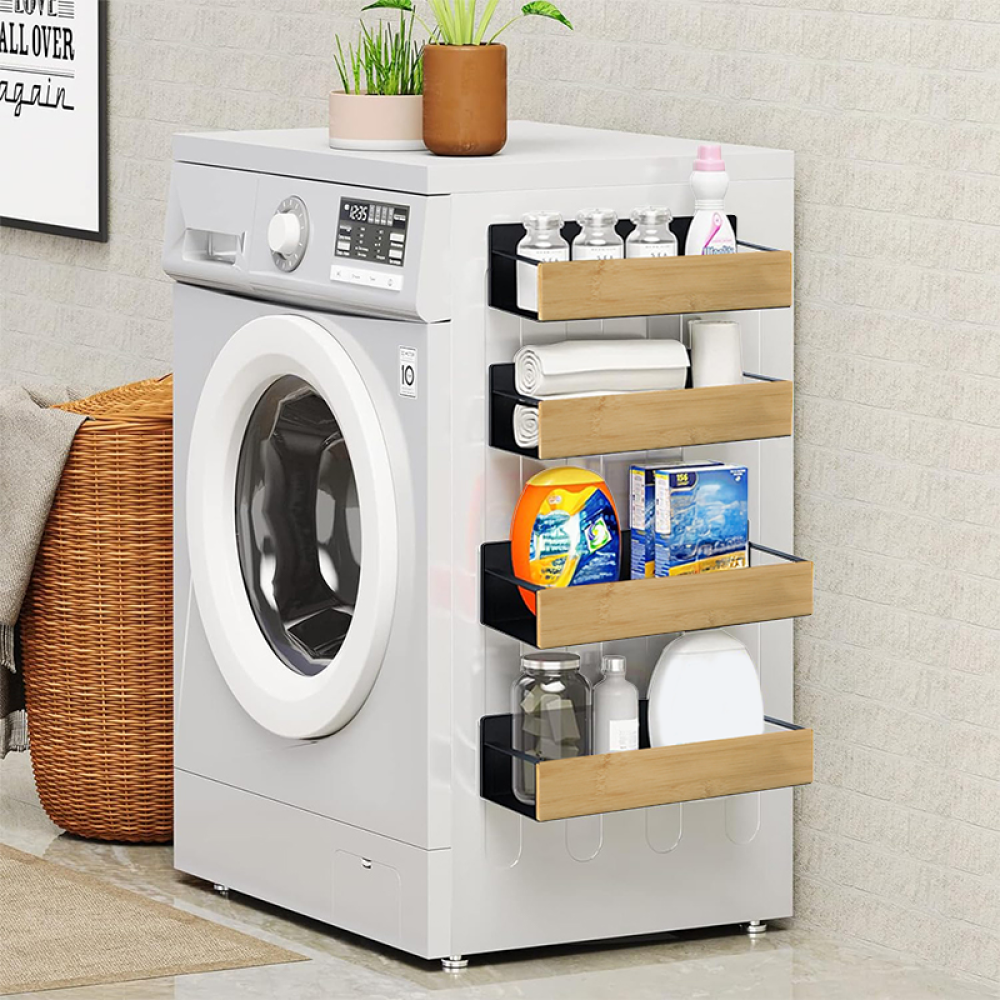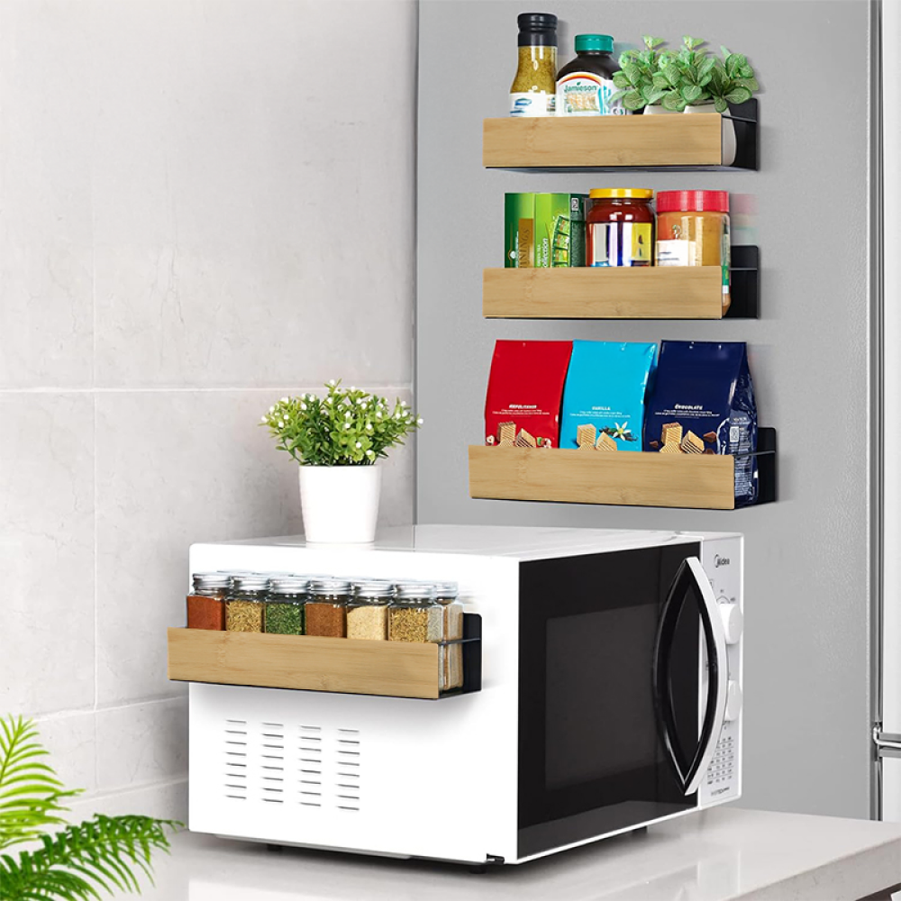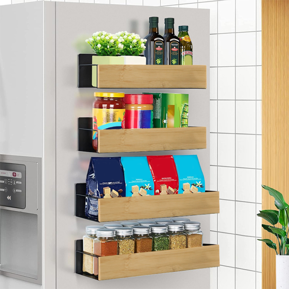 Material: bambus/oţel carbon Culoare: maro/negru Dimensiuni (lxAxh): 27x8,5x7,5 cm (2x) Dimensiuni (lxAxh): 29,5x9,5x7,5 cm (2x) Portanţă: 4 kg 4 poliţe 6 cârlige Fixare magnetică Practice Moderne Multifuncţionale Uşor de montat Potrivite pentru frigider, maşină de spălat, cuptor cu microunde, table metalice şi alte suprafeţe metalice Livrat asamblat
