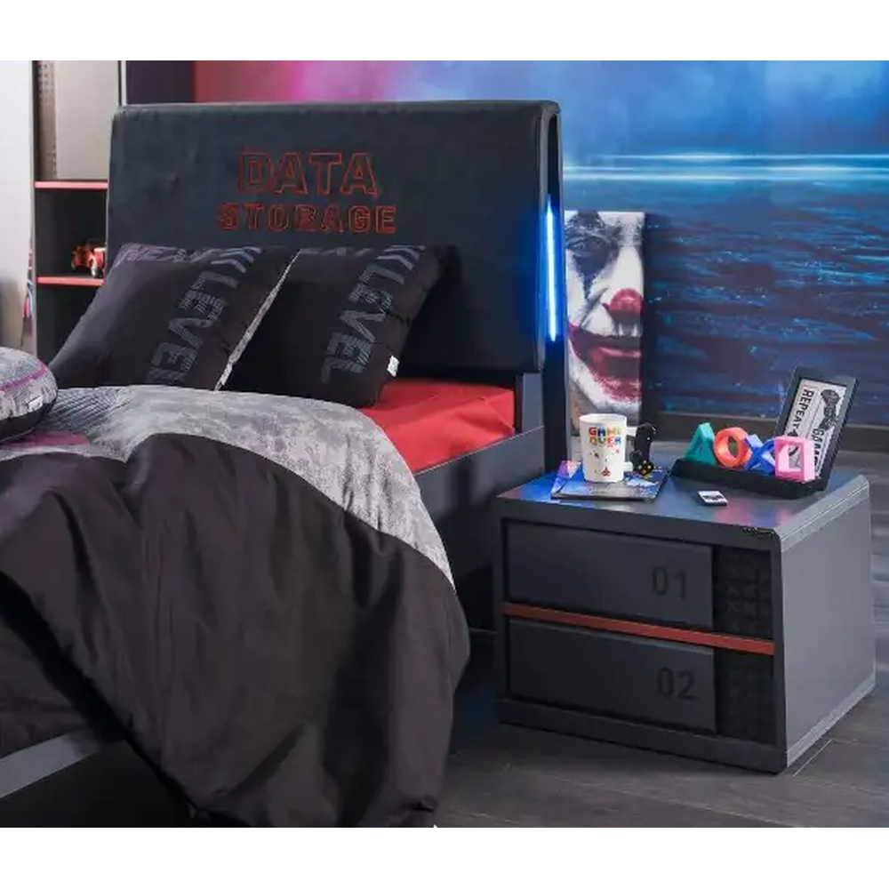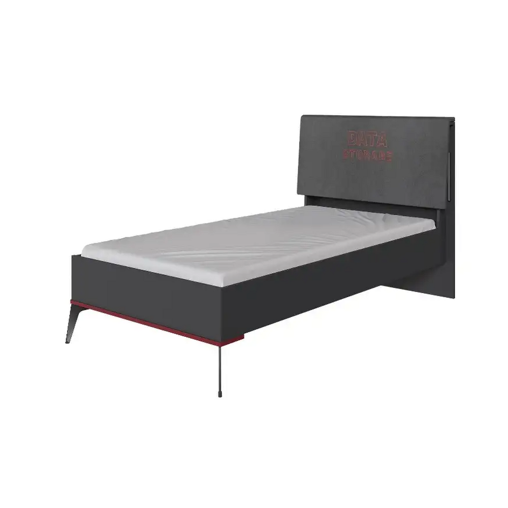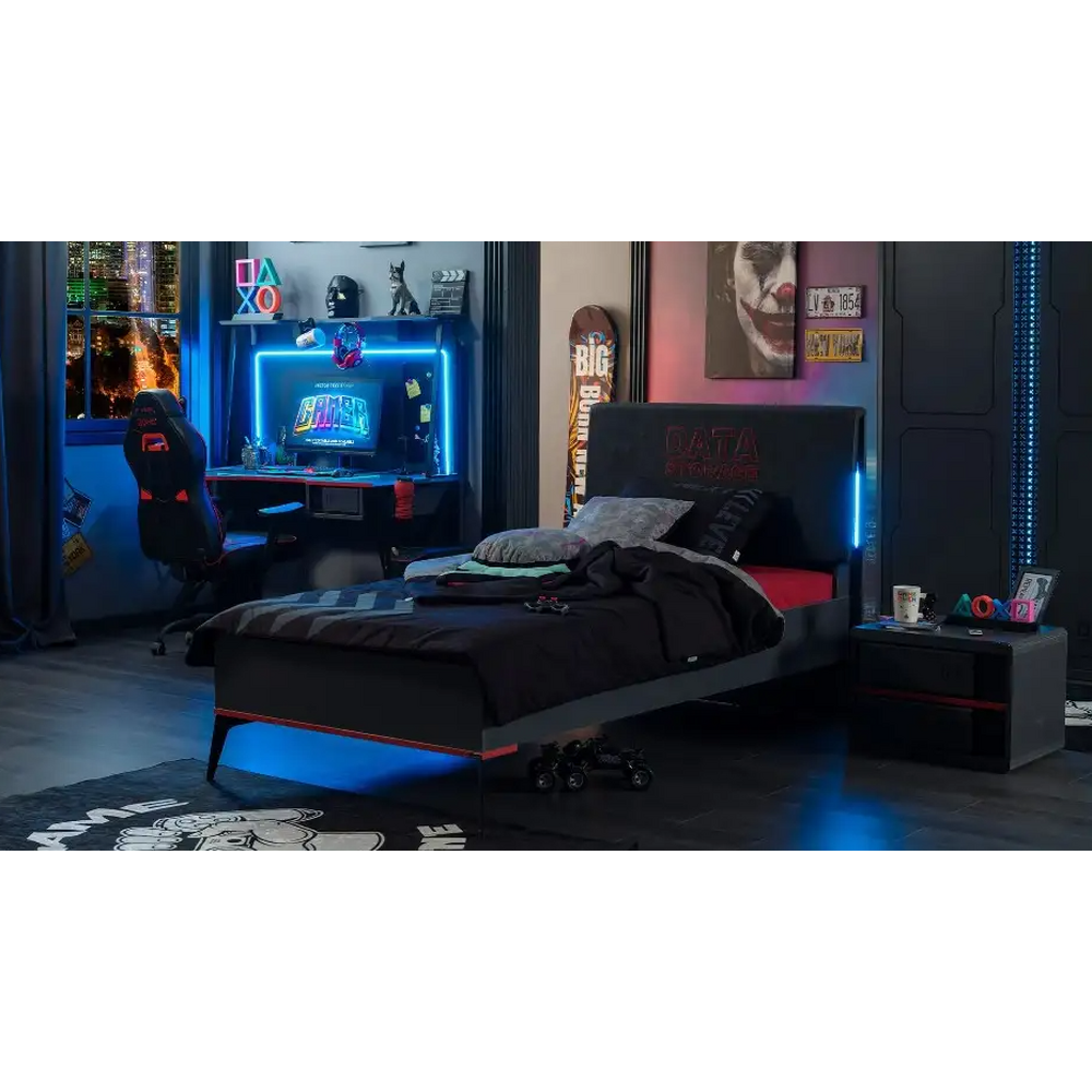Patul de 1 persoana Arcade este piesa de mobilier ideala pentru amenajarea unei camere de tineret sau a unei personane pasionate de jocurile pe calculator, oferind un design interesant. Patul Arcade pentru copii are tablie capitonata cu emblema ''Data Storage'' si pe laterale tabliei aplicate LED-uri .