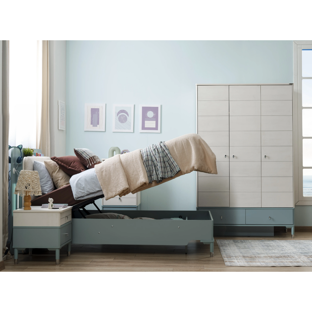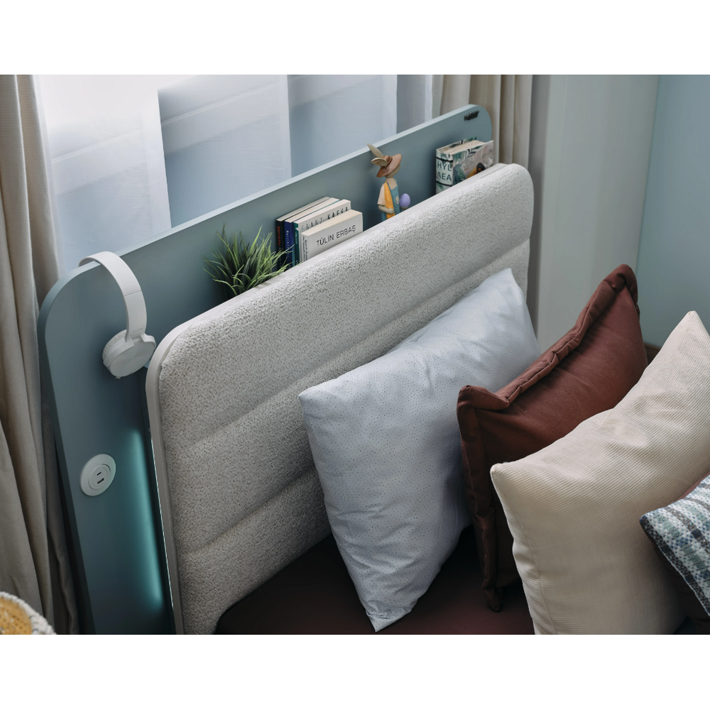 Cele 5 module disponibile acoperă toate funcțiunile necesare într-o cameră de copil: zona de studiu, reprezentată prin etajera inalta  și birou cu panou suprainaltat  zona de depozitare și somn reprezentată prin dulap cu 3 usi sau 4 usi, patul de 100 sau 120 și noptiera. Benzile cu LED-uri sunt inserate la tablia patului fiind incluse în preț.
