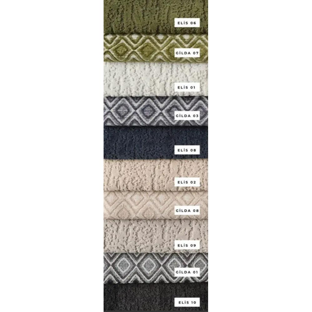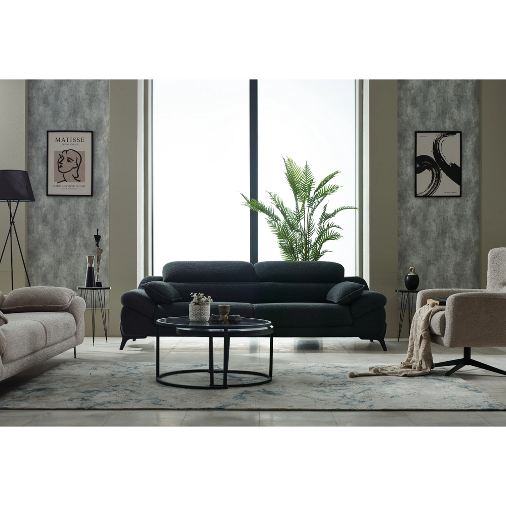 este tapitata in stofa Boucle iar finisajul imprima un aer sofisticat si