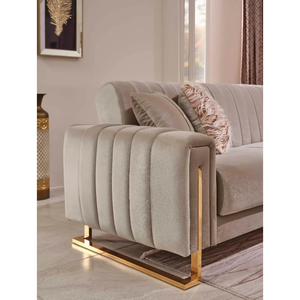 Caracteristicile designului modern, liniile drepte, simplitatea si atentia la detalii reusesc sa construiasca un cadru extrem de elegant. Nuanta este un caffe latte cald ofera o senzatie de armonie si echilibru contrastand cu detaliile tip oglinda al bratelor.