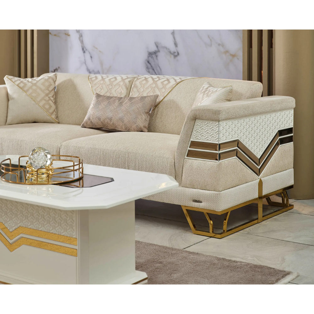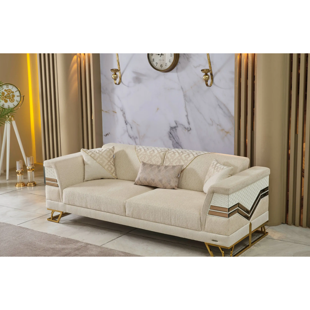 Constructie: Schelet metalic,lemn de fag ,stofa impermeabila,ornamente auriu,picioare metalice,oglinda,stofa impermeabila.