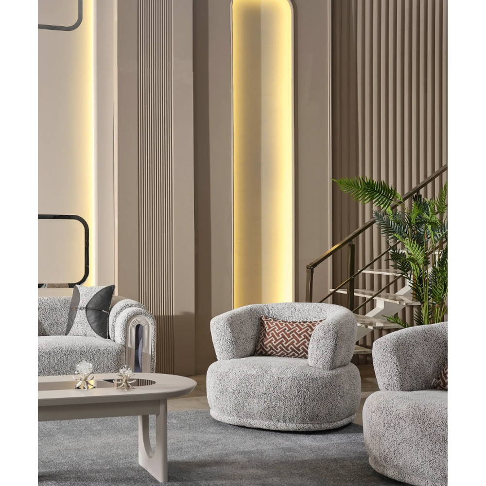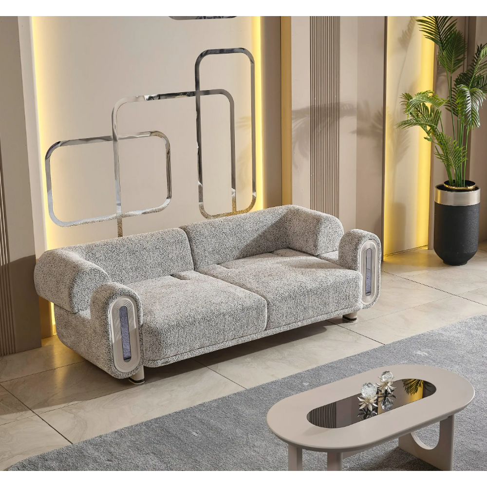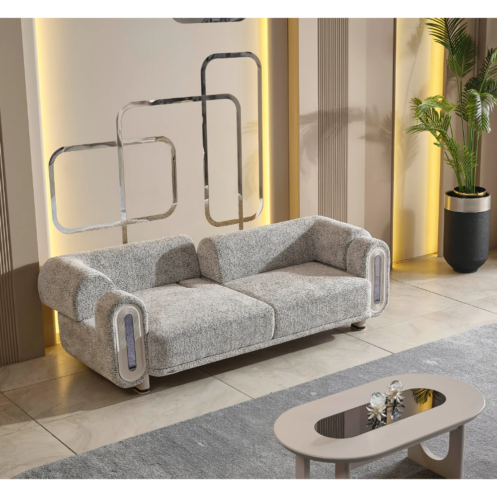 Constructie: Schelet metalic,lemn de fag,stofa Boucle.