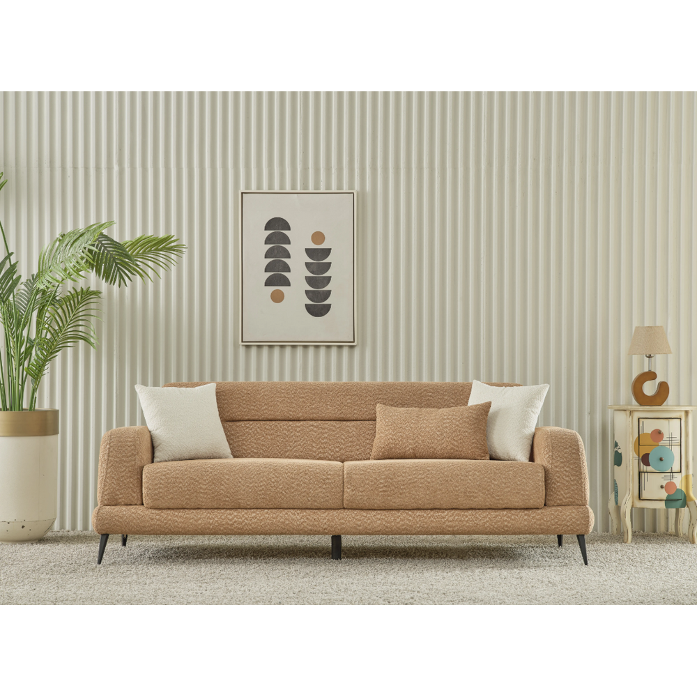 Setul Bergama are un design elegant, rezultat din combinația de linii clare, într-o geometrie perfectă,  cu o textură moale și confortabilă. Canapeaua moderna Bergama este caracterizata de brațele masive, picioarele negre vopsite electrostatic, si stofa molae Boucle are invaluie bratele acesteia.Liniile moderne ale canapelei ofera un accent subtil de lux, ce încântă prin finețe.