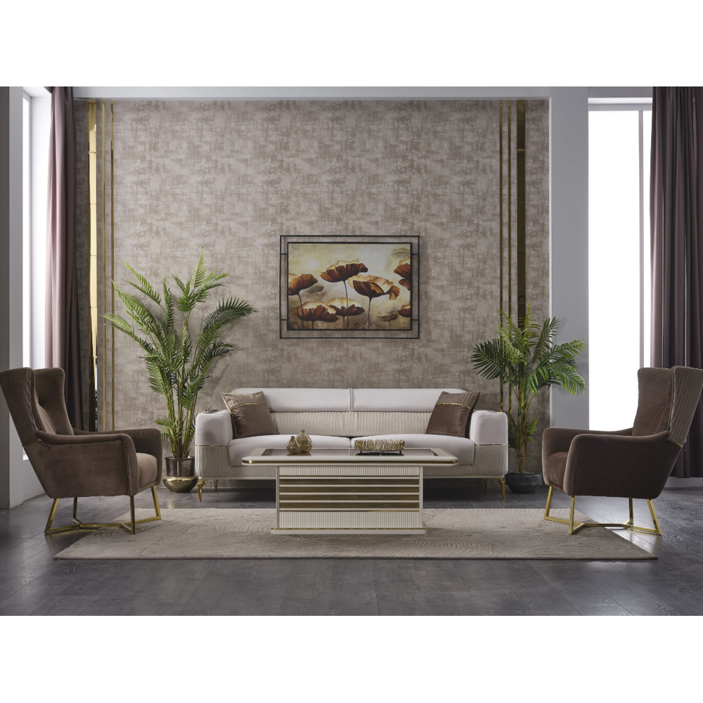 Acesta poate fi personalizat pe mai multe nuante, cu o tapiterie de calitate, care sa se potriveasca cu decorul casei tale. Asorteaza setul cu peretii, covorul si achitioneaza si alte piese de mobila in nuante de nuc sau bej.