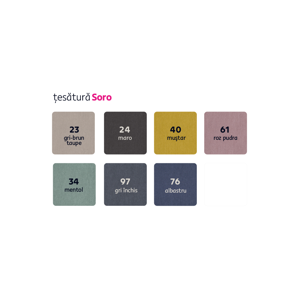 Vă oferim posibilitatea de a comanda canapeaua în 7 culori de ţesătură Soro, incluse în preţul de 5 639,-. Pentru comenzi individuale, este necesar un depozit de 10% din suma dată. După plata avansului, cererea dumneavoastră va fi introdusă în producţie. Timpul de livrare 6-8 săptămâni.