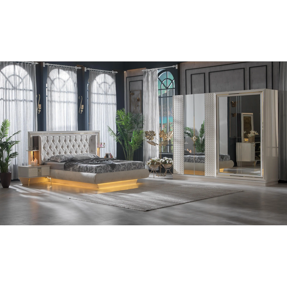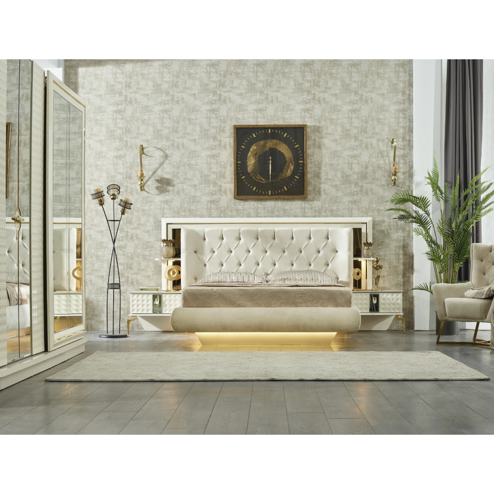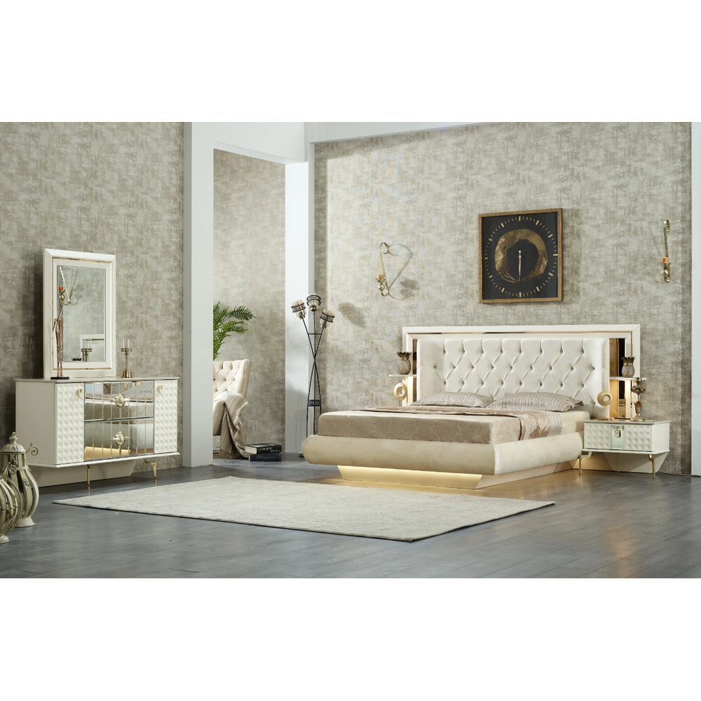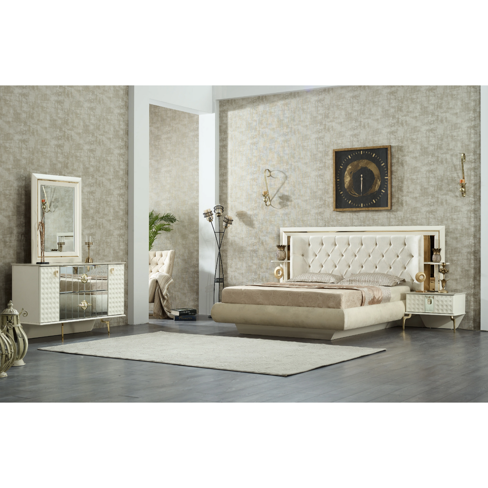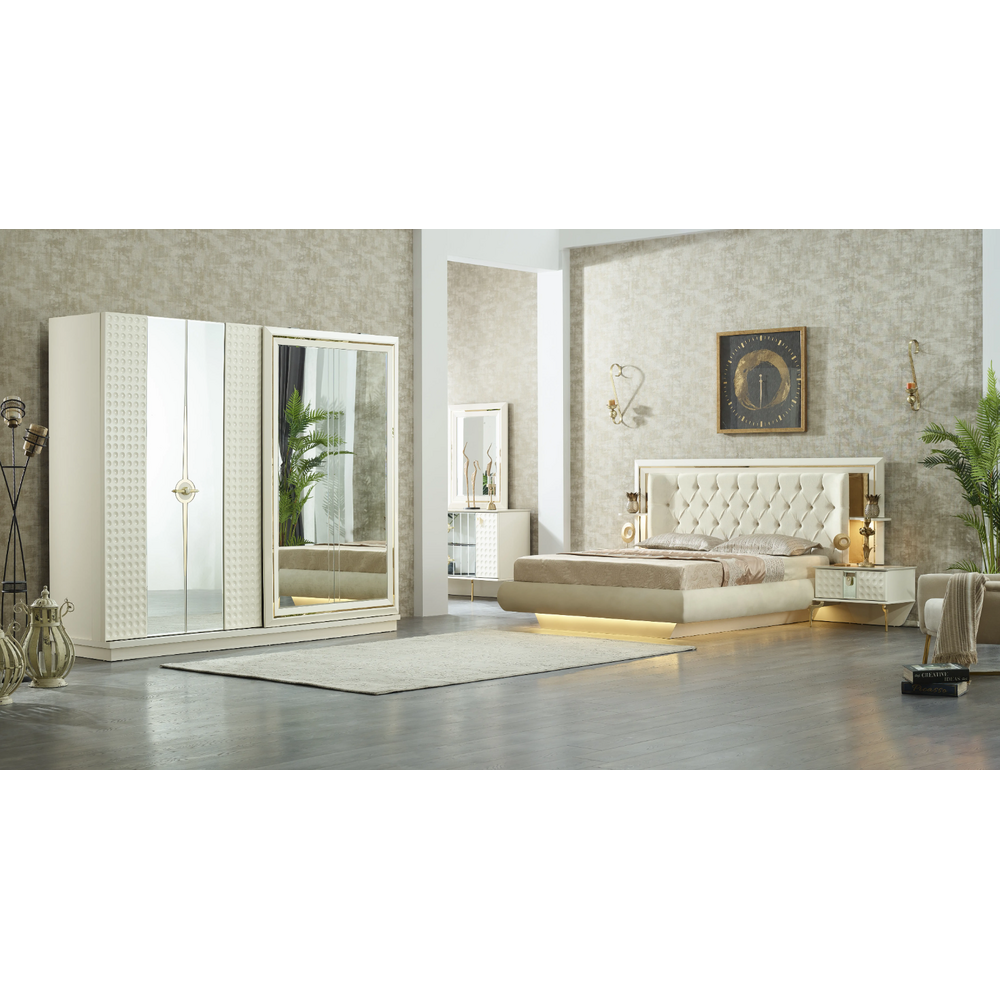 din MDF in nuante de crem a noptierelor, a mesei de toaleta si a dulapului de