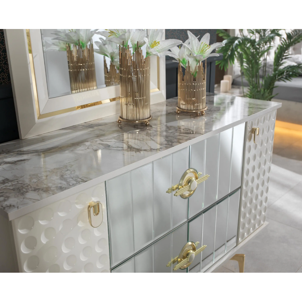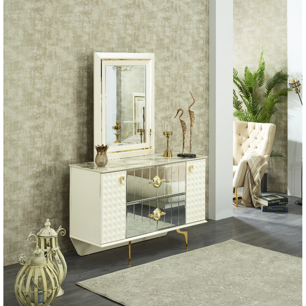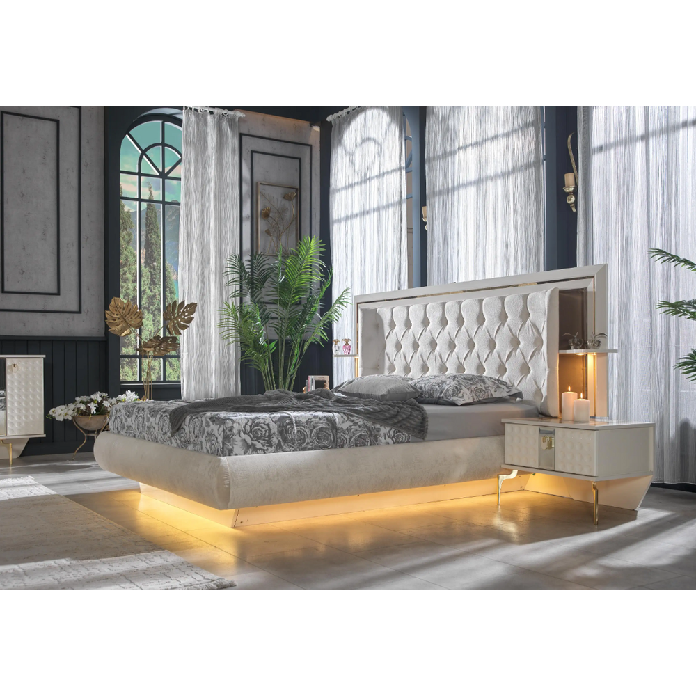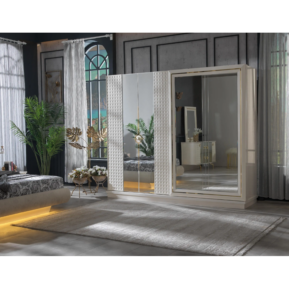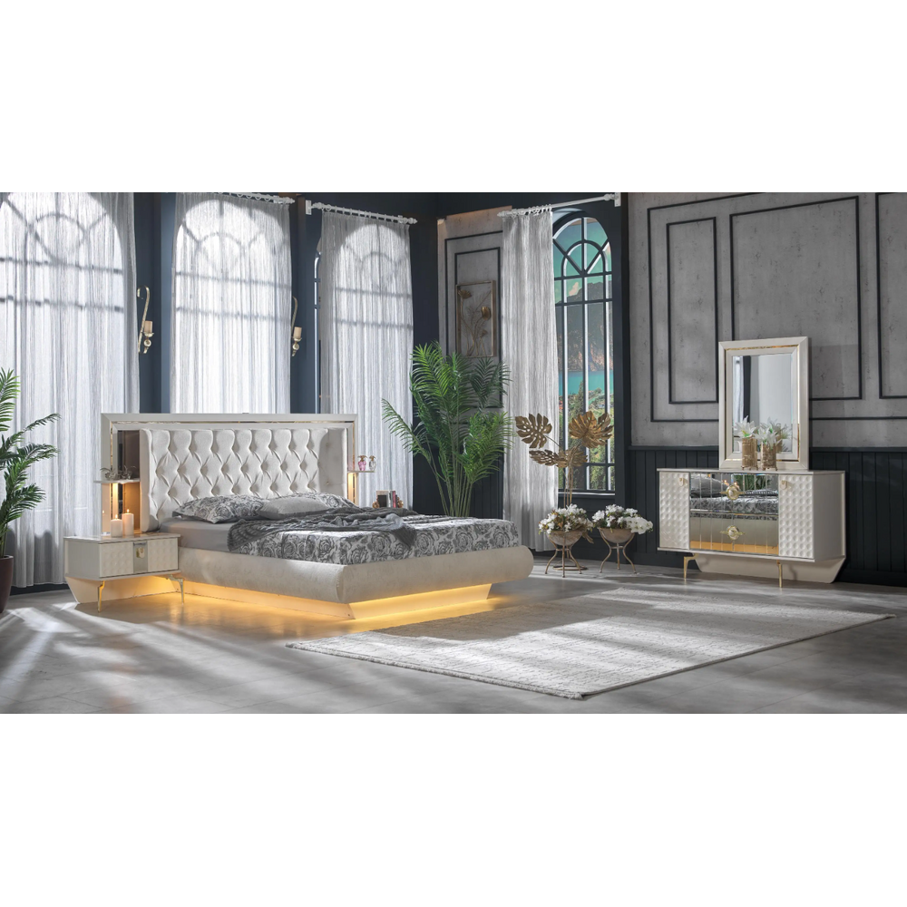 din MDF in nuante de crem a noptierelor, a mesei de toaleta si a dulapului de