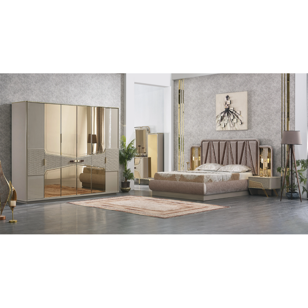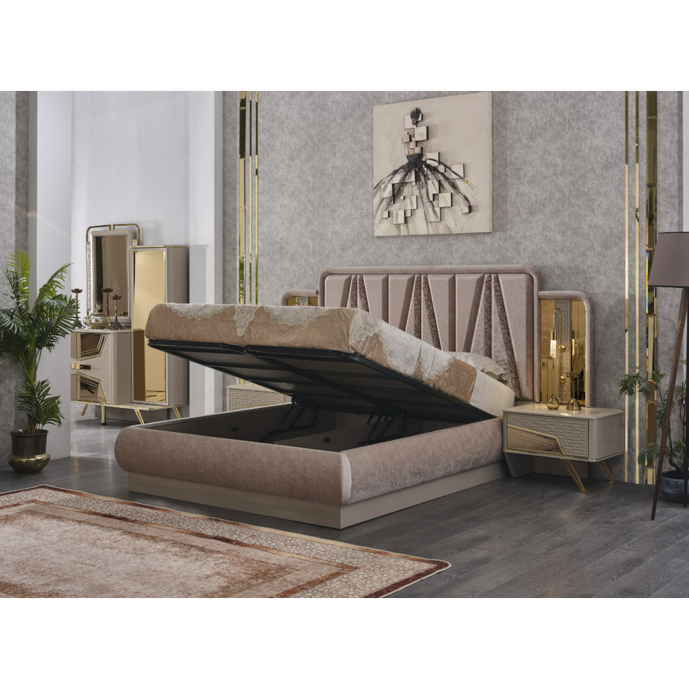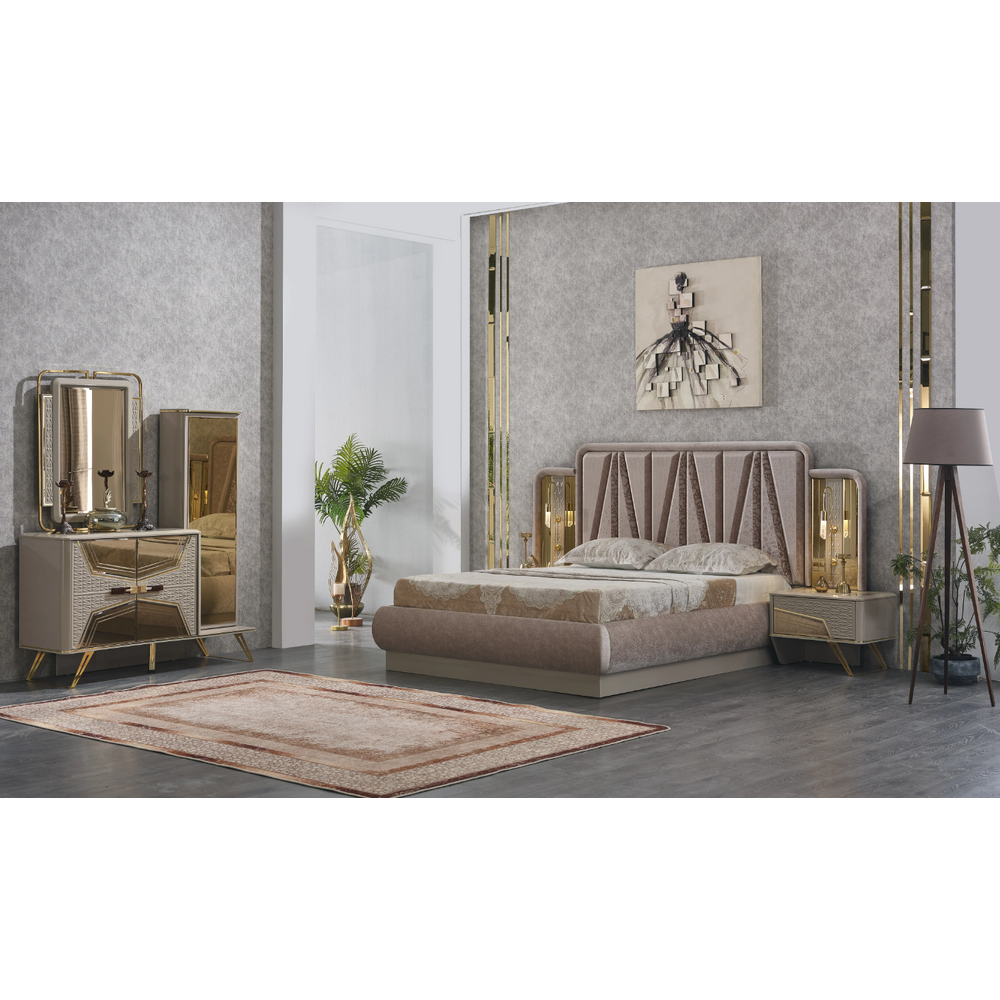 este cu siguranta piesa centrala a dormitorului, datorita tapiteriei elegante de un capuccino deschis, ce